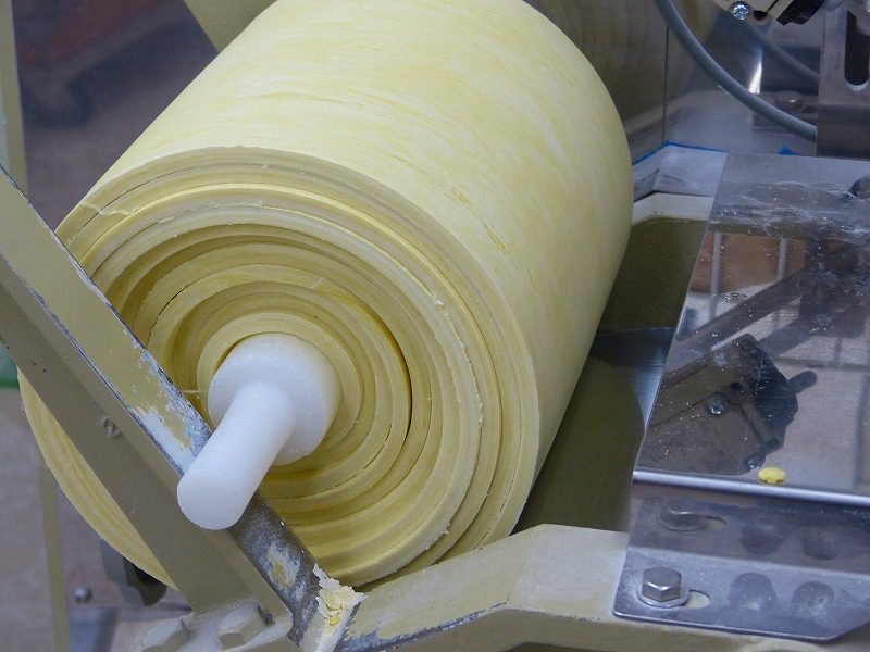 ミキシングで練り上げられた生地は、整形され、粗麺帯にまとめられます